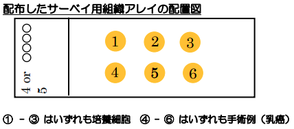 - 2) Ki-67染色後、以下の6コアについて、日常診療で用いている計測方法により、Ki-67陽性率(ラベリングインデックス)を計測いただき、回答ください。(ただし評価対象エリアは各コアについて,コア全体でお願いいたします)